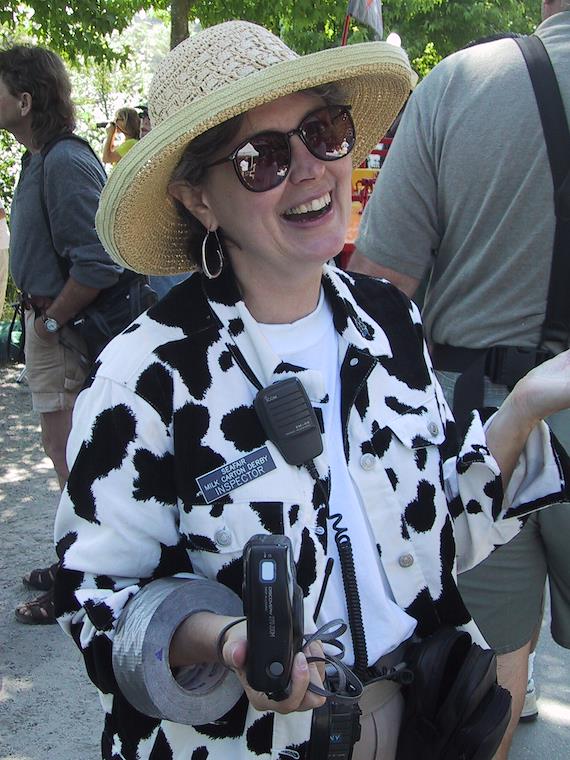 This lady is the official milk carton derby inspector. She goes around and makes sure that people don't use too much duct tape, etc.