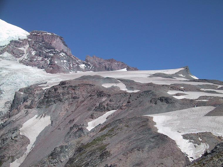 Just beyond the flat area is where Camp Muir is, the halfway point on the climb up Mt. Rainier. With binoculars, we could see people trudging up the mountain towards it.
