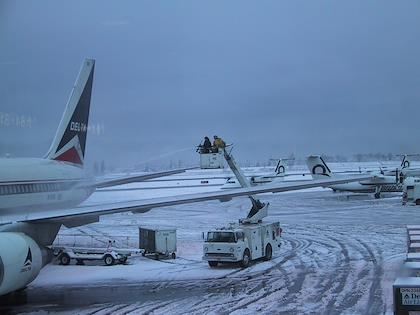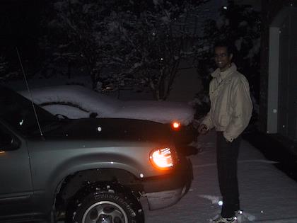 | Anand was nice enough to come in the early hours of the snowing morning to take us to the airport. Six to eight inches of snow fell that morning. | | Deicing the plane. |