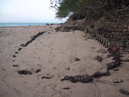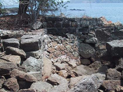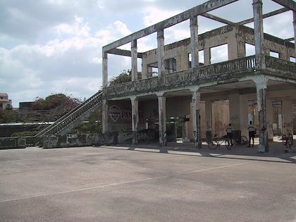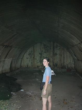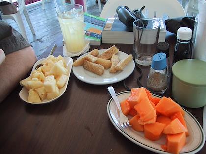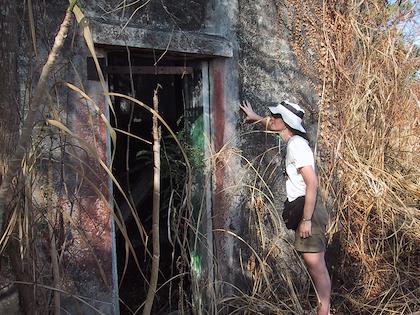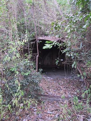 |  | |  | | Back at the restaurant that belongs to the hotel, we had some delicious papaya (right), pineapple, and fried yucca. | | We took a walk on some of the old paths around the island. During World War II, this was strong US military presence here, and you can see many old buildings and foundations. This is an old Quonset hut, built into the dirt. |