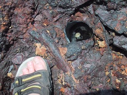 |  | |  | | A boiler, maybe? | | The black thing is the base of an old hand blown bottle. It's amazing how the bottles, over the years, melt into the old iron until it seems like they're a part of it. |
