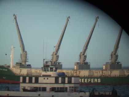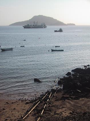 |  | |  | | At dinner (I think we were the only ones around--definitely not many tourists there) we found that we could combine the binoculars with the digital camera to make something like a zoom. It worked much better than expected. This ship is way out in the water. | | Leaving the next morning, these are some views of Taboga from the dock. |