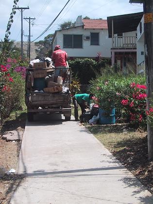 |  | |  | | I didn't quite understand the financial aspect of this (maybe it was in exchange for the lunches?) but some of the ships waiting to pass through the canal are fishing boats, and they give the less desirable fish to the islanders, who clean them right at the waterside. | | The trash pickup is one of the few motorized vehicles on the island. |