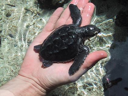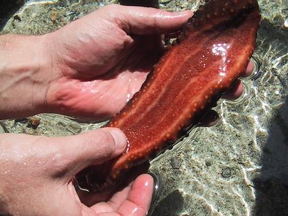 |  | |  | | There was a tank with sea creatures in it that you could touch. Eric's holding a sea cucumber here. | | And here, a sea turtle. |