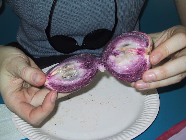 Here's another strange fruit we tried. Probably wouldn't try it again, but it was interesting. The outside looks like a small round eggplant, and the inside is filled with large seeds with an edible pulp around them. It left a strange gummy paste on my lips.