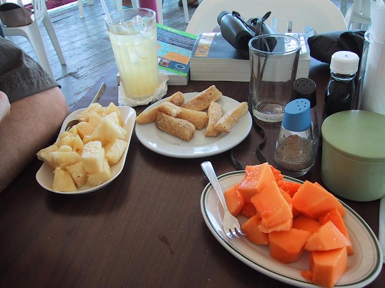Back at the restaurant that belongs to the hotel, we had some delicious papaya (right), pineapple, and fried yucca.