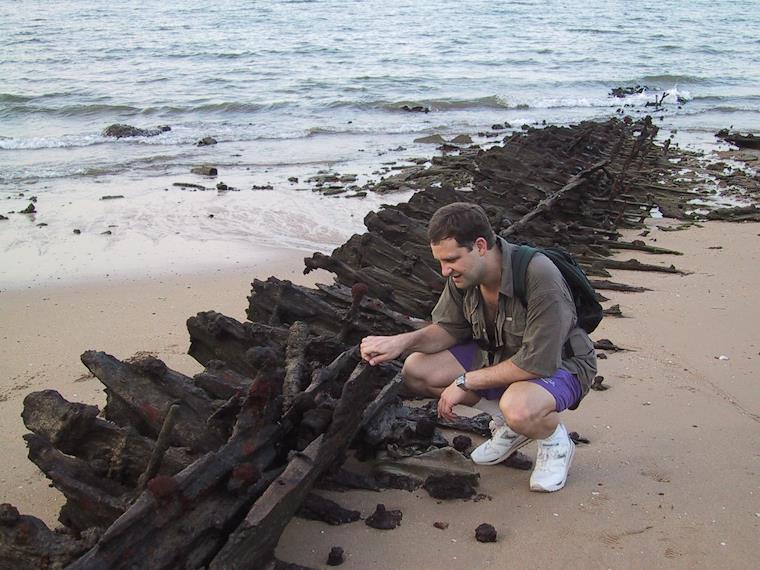 On the way back, the tide was very low. The wreck of an old boat was on the beach.
