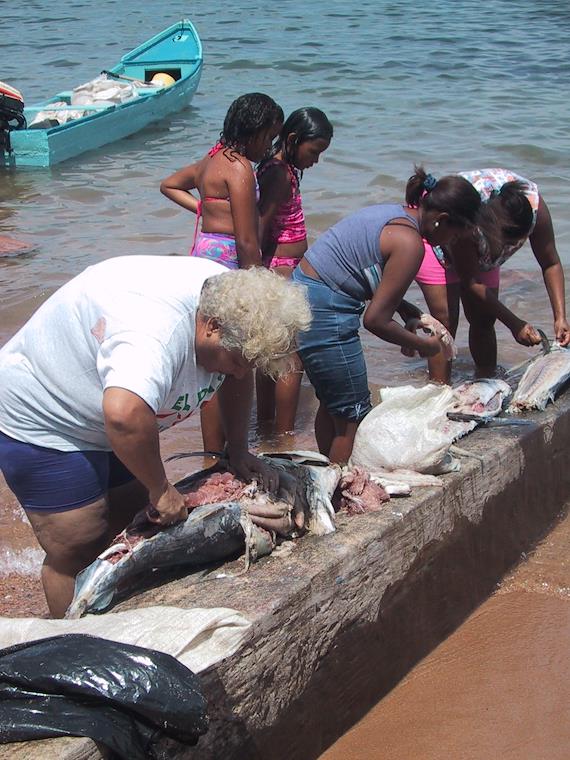 I didn't quite understand the financial aspect of this (maybe it was in exchange for the lunches?) but some of the ships waiting to pass through the canal are fishing boats, and they give the less desirable fish to the islanders, who clean them right at the waterside.