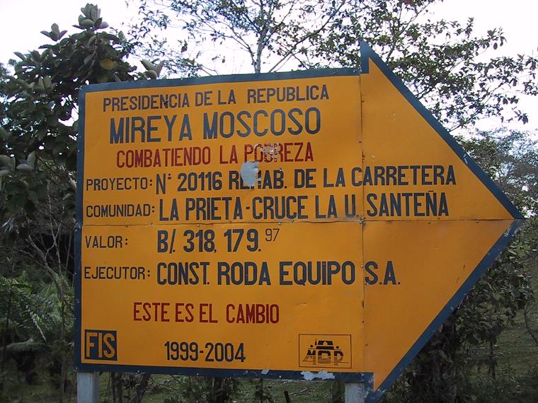 The president of Panama has these signs all over the country, describing various development projects that are underway. The top of the sign says, "President of the republic Mireya Moscoso, combating poverty. It's just some road repairs, though.