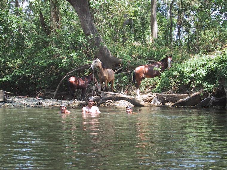 Some boys going for a swim. Horses are a popular way to get around in the backcountry.