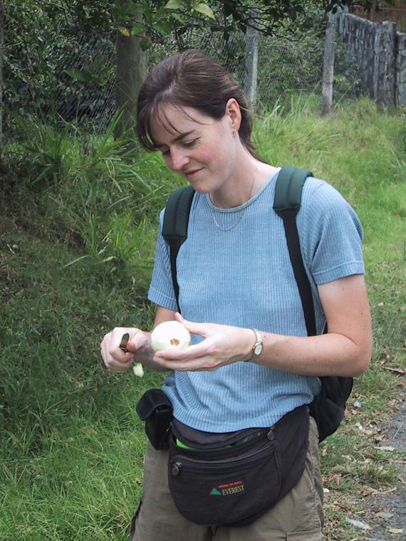 Eric picked an orange for me, and I peeled it as I've seen them done in this area, cut it in half, and sucked on the juice. The oranges are fine, but they're not very sweet.