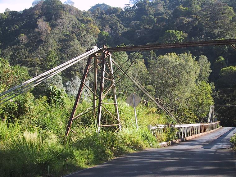 Another interesting bridge. It's a suspension bridge, but the cables are just stretched over top of the tower, instead of being attached there.