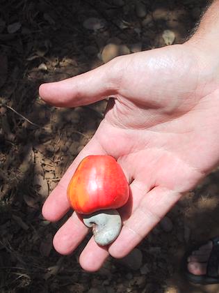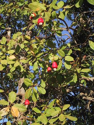 | Our destination after visiting Boquete was Isla Boca Brava. There's a (very) rustic lodge there. It's way off the beaten track, and as we were slowly driving down the dirt road there, we found a cashew tree! I first noticed the red fruits hanging in the trees. | The red part is the called the cashew apple, and is edible. This was the first time I'd tried it. It's very juicy, but a little on the bland side, with a strange taste. The thing hanging down is, amazingly enough, the cashew nut! No wonder cashews are so expensive, if it takes a whole fruit to produce one. | ||||||||||||||||||||||||||||||||||||||||||||||||||||||||||||||||||||||||||||||||||||||||||||||||||||||||||||||||||||||||||||||||||||||||||||||||||||||||||||||||||||||||||||||||||||||||||||||||||||||||||||||||