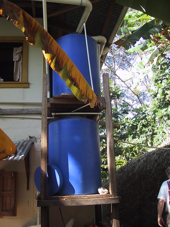 He has a system to catch rainwater, which fills up in about a 2 hour downpour. However, his previous renters had used up all the water, and so they were buying water in town.