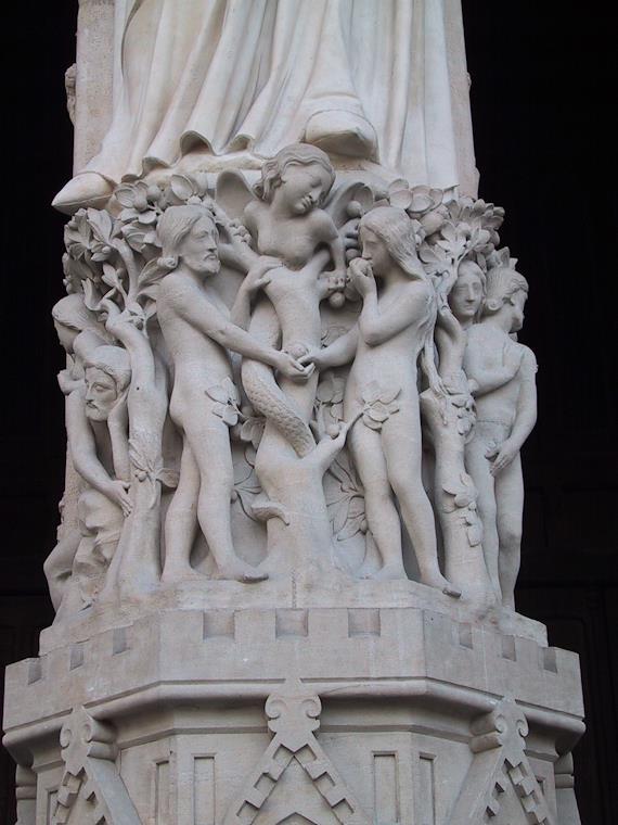 A statue at the outside door--Adam and Eve eating of the Tree of Knowledge, tempted by a serpent (the top is a woman, the bottom a serpent).