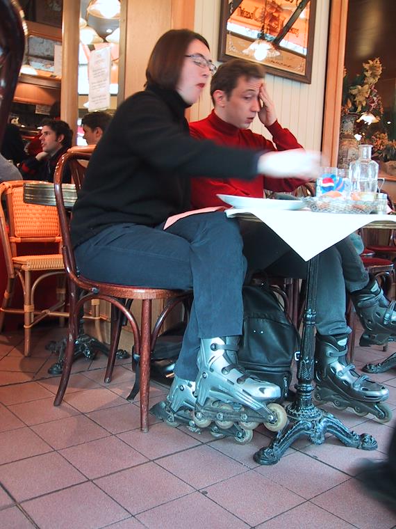 I was amazed at how popular roller-blading is in Paris. Seems like many people actually use it as a means of transportation. We had some coffee in a cafe (which are amazingly smoky, incidentally), and saw this couple taking a break from their outing.