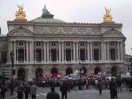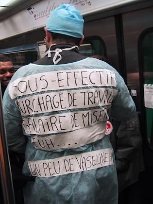 | This coat was in the fashion show, one of the first things that they displayed. Right after Eric took this picture the lady came up and said no pictures. | | We found the hospital strikers again, just in front of the opera. It seems like striking in France is a national obsession. They tied up the traffic tremendously--good thing we weren't driving. |