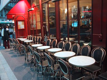 | Another Jules Verne store (our second) | | A typical Parisian cafe, with chairs on the sidewalk. It's a little to cold to be drinking coffee outside, though. |