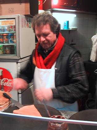 | We bought our first crepe from this guy, and almost got ripped off by him. It was 15 F, we gave him 50 F, and got back 25.20 F. He was hoping that we�d think the 20 centime coin was a 10 F coin (they both have a bronze color). After we�d walked away, Eric counted the change and realized we were short. We walked back and told him we didn�t get the right change. First he said he�d given us another 10 F coin, but then he he gave us the right change. | | A bookbinder in his workshop. |