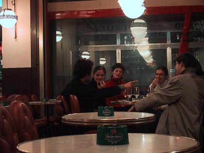 |  | |  | | Another crepe, this time a plain butter and sugar one. | | In the evening we went out to a cafe right next to the Sorbonne, frequented by students. There was an extremely animated group of students there that we took a discrete picture of. |