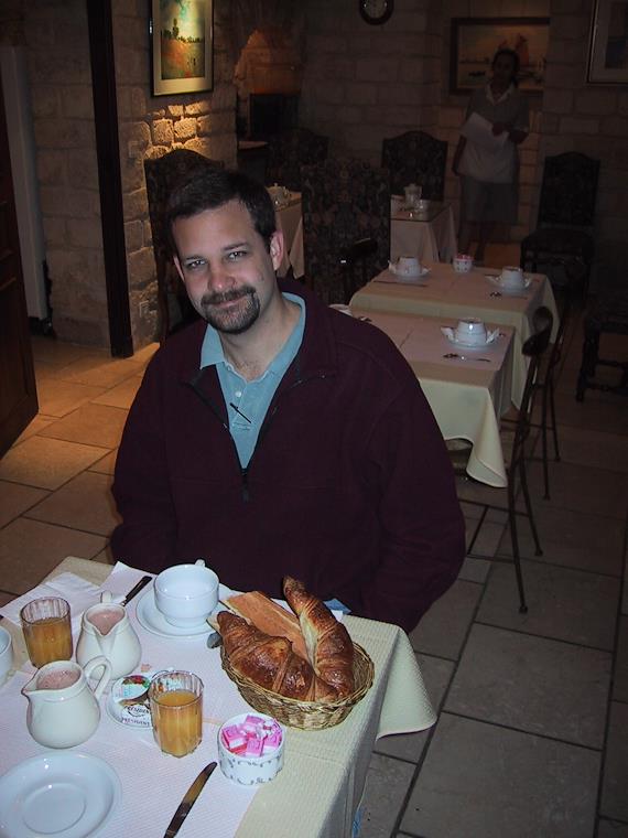 Breakfast of champions at the hotel. Breakfast was very continental. It consisted of coffee, tea, or hot chocolate, with a baguette and croissants, butter and jam. No honey, so I bought my own and used that.