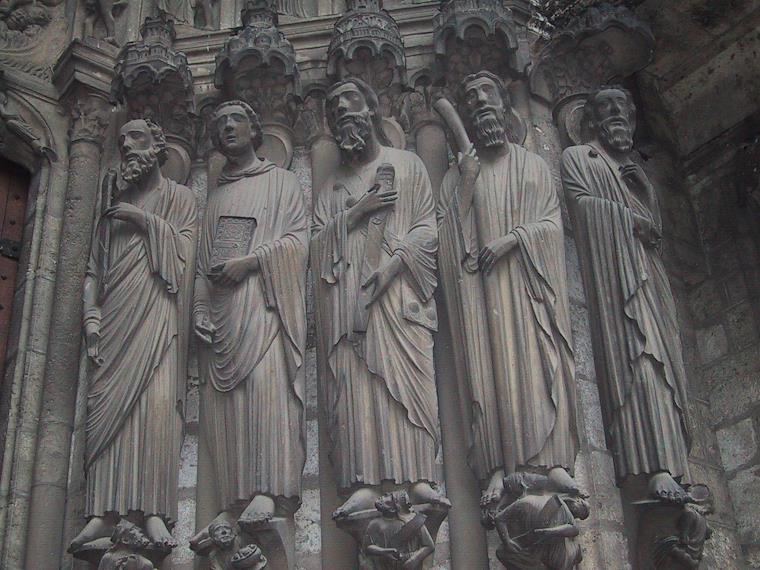 Notice these statues are significantly less elongated, compared to the Romanesque ones. These are all saints that were martyred (i.e.killed). Some of them are carrying the instruments of their execution (notice the stick, of a staint that was beaten to death, and the sword, of a saint that was beheaded.