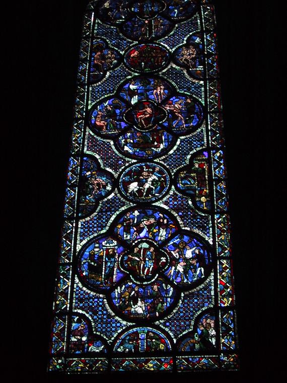 This stained glass window tells the story of the good Samaritan. The windows helped to instruct the illiterate (which was almost everybody) in religion back in the middle ages. The Chartres cathedral is very famous for its stained glass windows, almost all of which are from the 13th century.