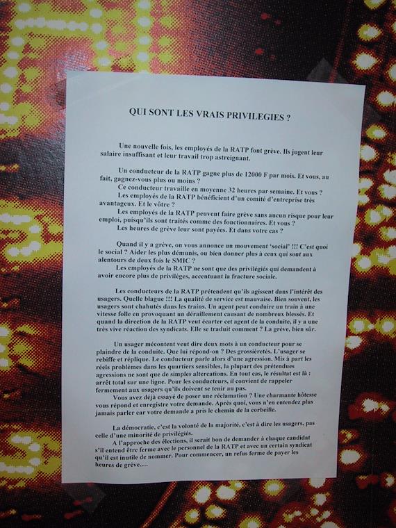Yikes! A metro strike! We'd walked to the train station from the hotel in the morning, about a 35 minute walk, and were going to try to take the metro back, even though there was a strike on. Supposedly 20% of the trains were running, so we figured we would just have to wait a little. But after about 10 minutes of waiting, there was an announcement saying that our metro line wasn't going to get any trains. This is an anti-strike essay taped up on the wall, talking about how the strikers are paid for their strike hours, only work 32 hours a week anyway, etc, etc.