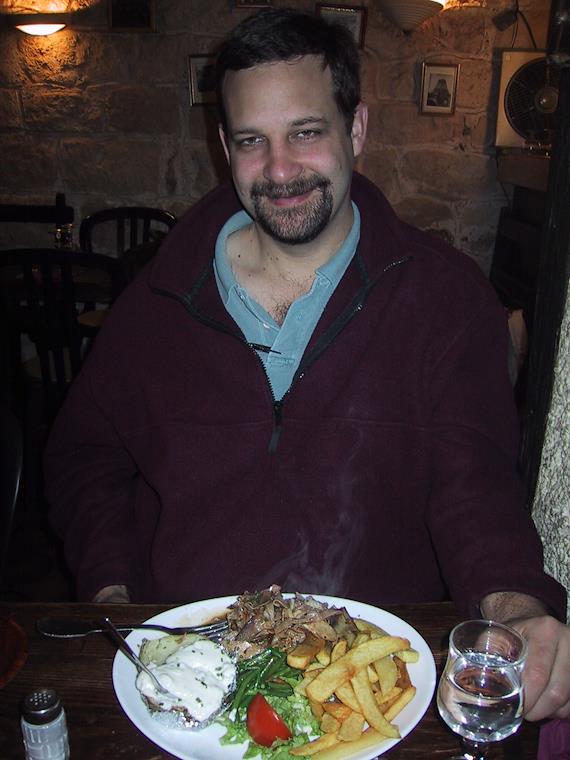Eric and I eating dinner that night. We walked around Mouffetard street, which is full of restaurants, to find this place. Eric had capon (castrated rooster) and I had lamb. Not bad at all, although the smoke in the restaurant was terrible.