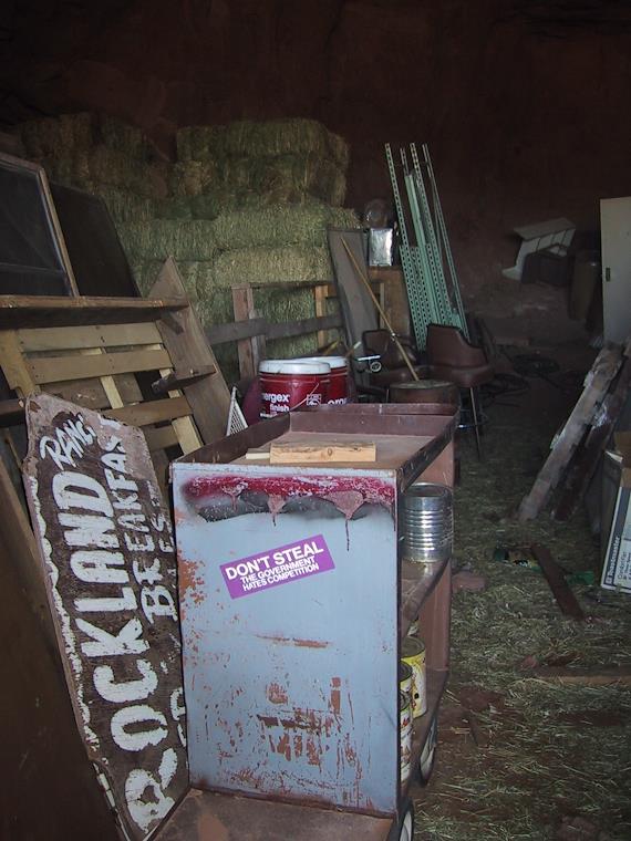 A storage hole blasted into the rock. The bumper sticker on the cabinet says "Don't steal--the government hates competition". Bob is not a big fan of the government.