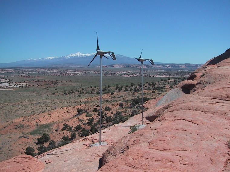 The windmills on top of the rock produce enough energy to run some power tools.