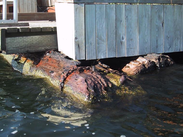 Most of the houseboats float on these huge timbers, some of which look kind of worm-eaten.