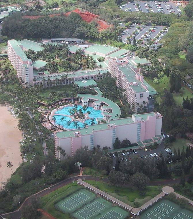The next day, Eric and I took a helicopter tour around Kauai with Eric's mom Anne and my father. This is the Marriott from the helicopter.