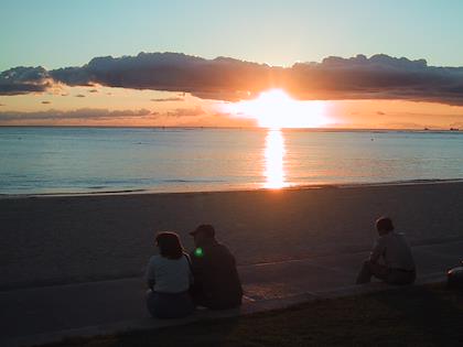 | There's very bad traffic in Honolulul. We were stuck in traffic on the way back to our hotel, the Outrigger Reef. | Everyone on the beach stops to watch the sunset in the evening. | |