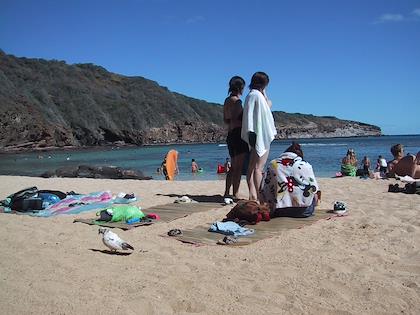 | We met this guy on the beach at Waikiki. He searches with his metal detector for lost rings on the beach, and operates a business in Oregon called Bearied Treasure to find people's lost rings. This summer he's going to New Zealand to look for gold there. | Hanauma Bay. Very crowded, but great snorkeling | |