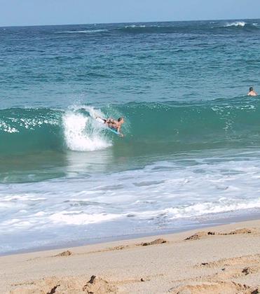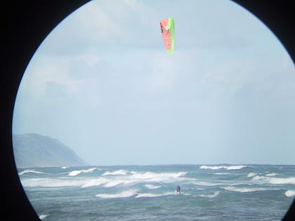 | Still, some boogie boarders were out. | Further south, we watched a guy surfing with a paraglider. Now that was impressive! | |