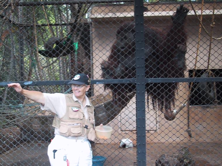 A volunteer was entertaining the gorilla with bits of food and toys.