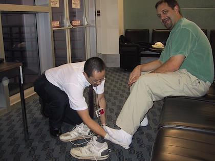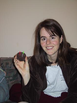 | We were supposed to start on the 23rd, and my birthday (the 24th) would have been in the air. Eric set up a little birthday cake, complete with glowstick "candles", because he figured he wouldn't be allowed to bring matches on board. How thoughtful! Since we had to delay the trip because I got sick, I had my birthday cake at home. | | Just before we left, some wacko tried to set off a bomb carried in his shoe. So at the airport, they checked our shoes very carefully, because we fit their profile - one way ticket, bought the ticket within three days, and it was an international flight. The inspector was super friendly, though. |