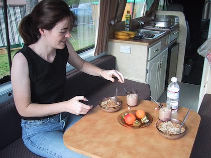 | A nice healthy breakfast of oatmeal, apricots and kiwis (cheap!), and yogurt. | | We saw this plant everywhere along the side of the road - it's New Zealand Flax. To our eyes it was very beautiful and exotic looking, but it appears to grow everywhere there. |