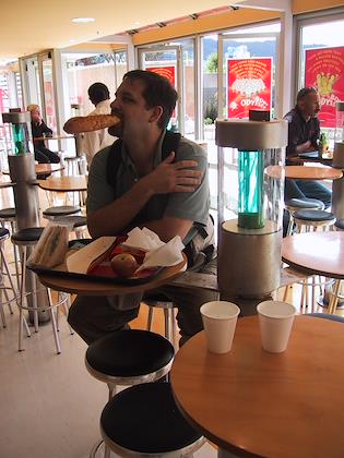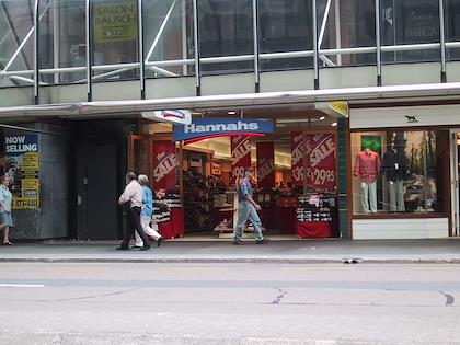 |  | |  | | This reminded us of Grace and Gary's daughter, Hannah! It's a shoe store, though. | | Later on we went to Te Papa, the national museum. This is Eric in the museum cafe, where we had lunch. |