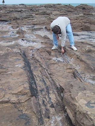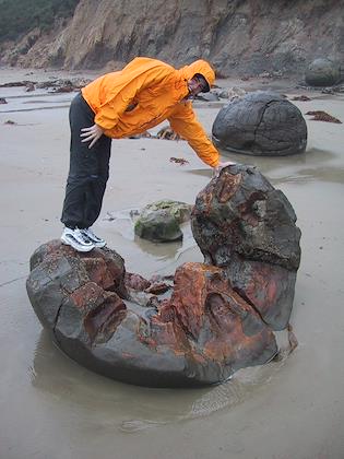 | This is about as much as we saw of Dunedin. It was raining very hard, and was also very windy, so we left after confirming that the weather would stay bad. The road from Dunedin to Christchurch was closed later because of flooding. | | The Moeraki Boulders, north of Dunedin, were well worth a detour. They're formed by calcite crystalizing around organic nuclei. It's amazing to see almost perfectly round boulders laying in the sand. |