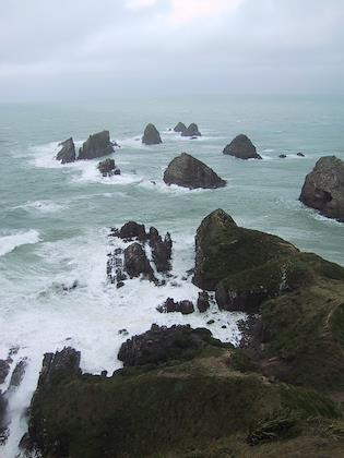 | We stopped at the Catlins River branch railway line, dug by hand. It's no longer used. | | Nugget Point is an isolated spot off a bad road. It's a wild and windy peninsula, with a lighthouse and lots of resident wildlife. We spent some time here watching seabirds trying to take off. A lot of them were thrown back into the sea by the wind. |