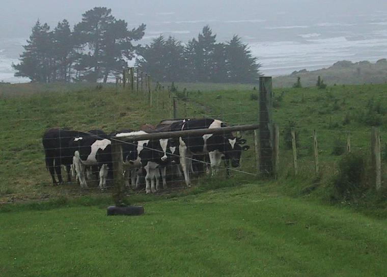 These poor cows are huddled in the far corner of the field, heads away from the wind.