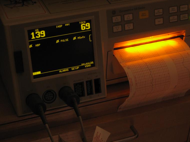 During labor, a machine monitors the baby's heart beat and mommy's contractions. His heart rate is 139 beats/min and the 69 indicates that Sylvia is in the middle of a contraction.