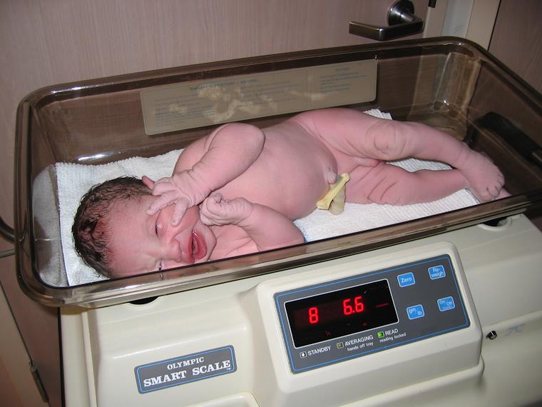 Shortly after he is born (10:57 AM, Sunday October 26, 2003), he is weighed. 8 pounds, 6.6 ounces. 20 1/2 inches long.