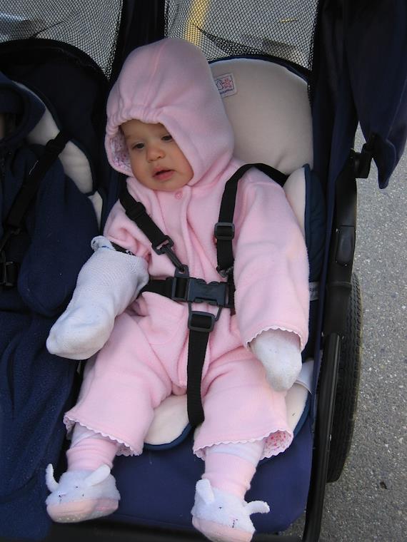 Marina is wearing impromptu mittens made of socks