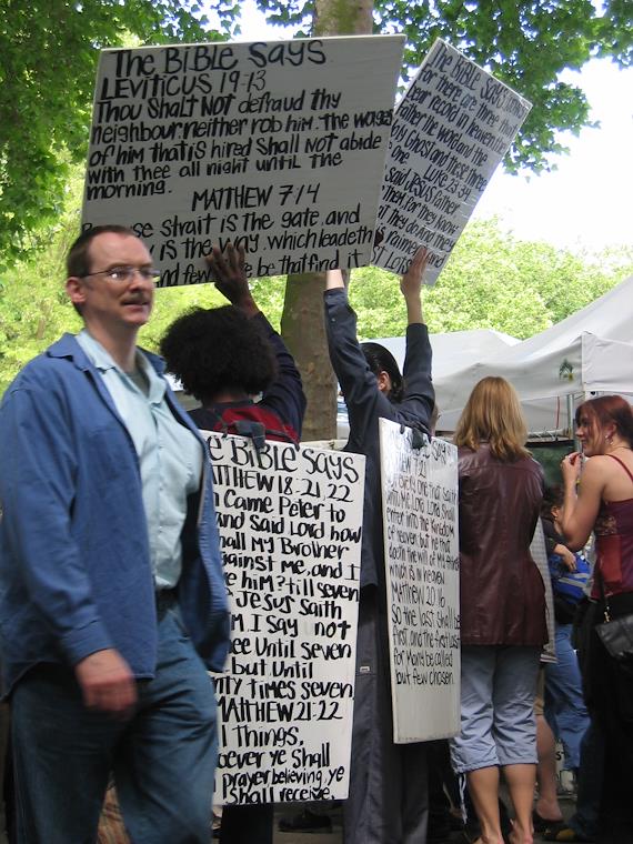 And these guys stood in the middle of a walkway with large signs that had bible quotations written on them.