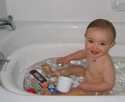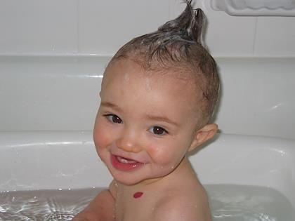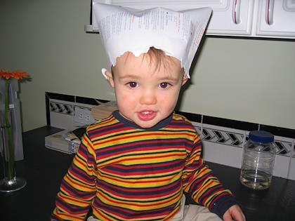 | Kenny looking chic in an envelope hat | | Kenny getting a bath |