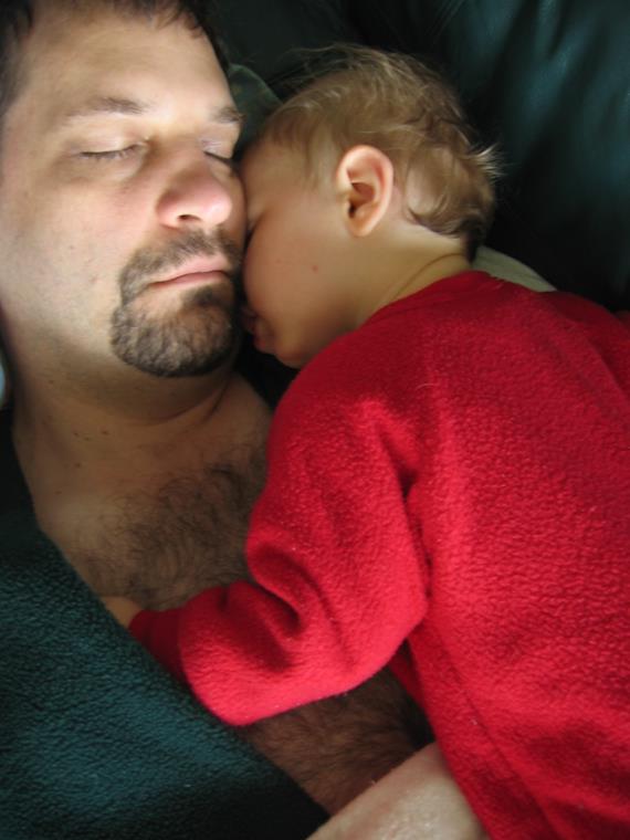 Kenny and Eric asleep on the couch, after an early morning wake-up.