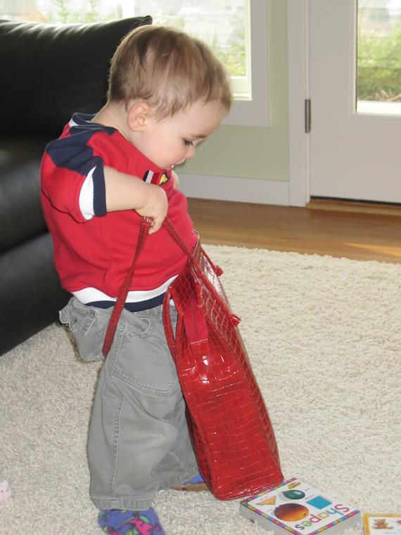 Kenny tries on Jean's purse
